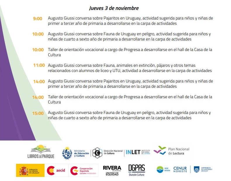 - 11:00 –Augusto Giussi conversa sobre Fauna, animales en extinción, pájaros y otros temas relacionados con alumnos de liceo y UTU, actividad a desarrollarse en la carpa de actividades