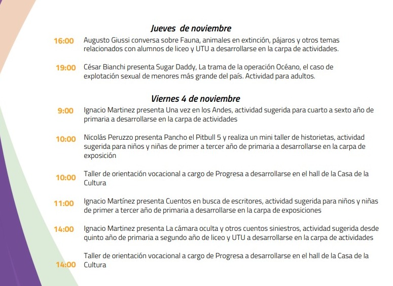 - 14:00 –Ignacio Martinez presenta La cámara oculta y otros cuentos siniestros, actividad sugerida desde quinto año de primaria a segundo año de liceo y UTU a desarrollarse en la carpa de actividades